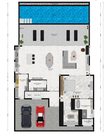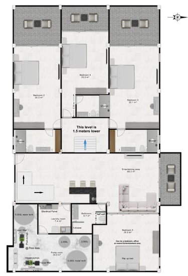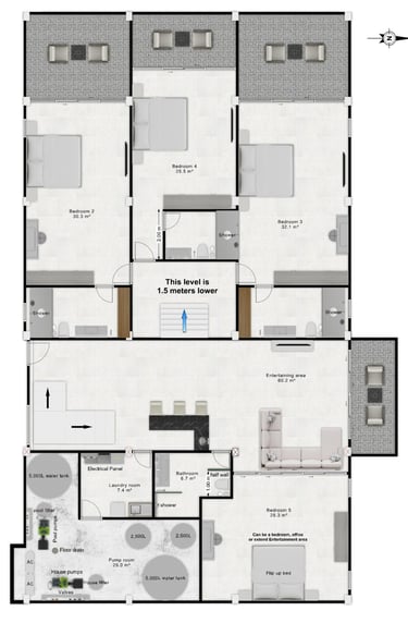 Layout: 5 bedrooms and 6 bathrooms, with the flexibility to convert the fifth bedroom into a large private office or extension of the lower entertainment area.